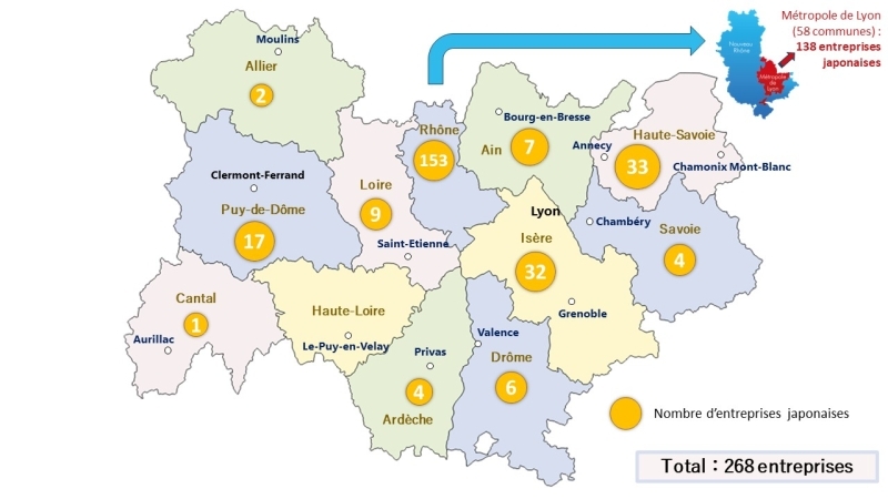 Chaque année, le Bureau Consulaire du Japon sollicite la coopération des entreprises japonaises pour répondre à l’enquête concernant la situation des entreprises japonaises implantées dans la région Auvergne-Rhône-Alpes.Selon les résultats de l’enquête de 2024, la région Auvergne-Rhône-Alpes comptait 268 entreprises japonaises.